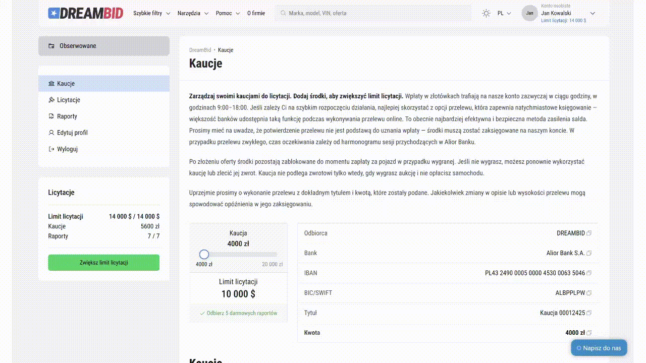 Po opłaceniu depozytu otrzymasz dostęp do określonej liczby darmowych raportów historii pojazdu (1 raport za każde 800 zł kaucji). Z raportu dowiesz się m.in. ilu było właścicieli, jaka jest historia serwisowa auta, czy nie cofnięto licznika i czy samochód nie brał wcześniej udziału w wypadkach.
